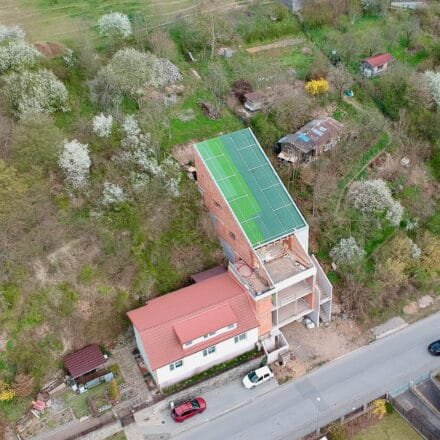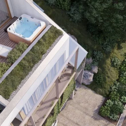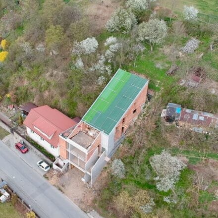 Dům je pokryt vegetační střechou, která notně zvyšuje životní komfort v domech. Není třeba ji zalévat a díky odparu zajistí ve svém okolí výborné mikroklima.